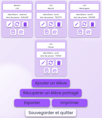 On peut télécharger un pdf avec les comptes d’élèves à imprimer ainsi qu’un fichier xlsx contenant tous les paramètres d’authentification de la classe.