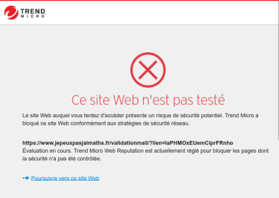 En créant un compte enseignant on accède à des fonctionnalités telles que la création de classes et de parcours d’activités. L’anti-spam académique peut générer ce message quand on clique sur le lien de vérification, mais cliquer sur « Poursuivre... » permet de passer outre cette alerte :