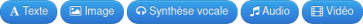 On peut créer des activités en utilisant du texte, des images, du texte lu par une voix de synthèse vocale dans des langues différentes, de l’audio (les fichiers doivent déjà être en ligne) ou de la vidéo (qui doit déjà exister en ligne) :